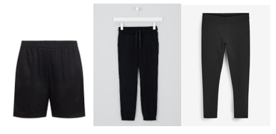 Black shorts, jogging bottoms or leggings. Items should be plain black and should not have logos.